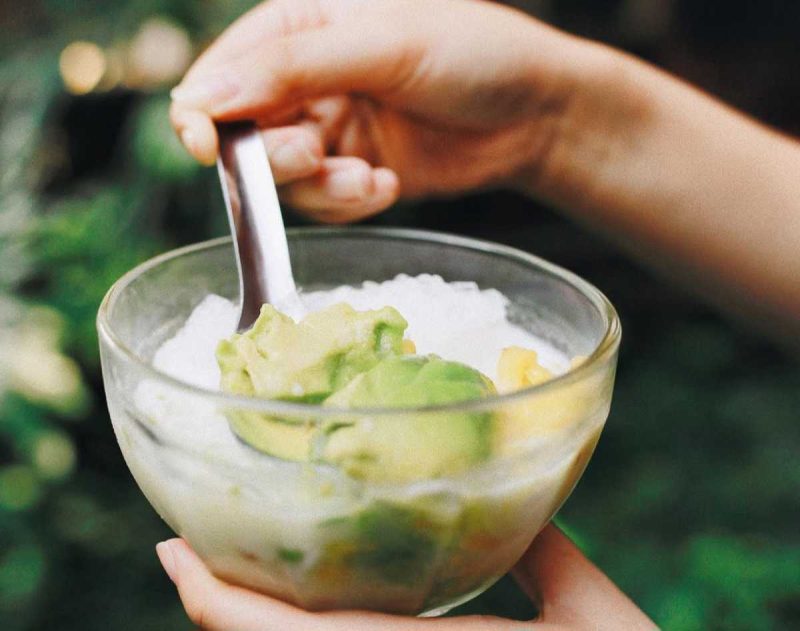 Cuci bersih semua buah. Iris alpukat dan nangka sesuai selera, keruk kelapa muda, dan seduh biji selasih hingga mengembang. Sisihkan.